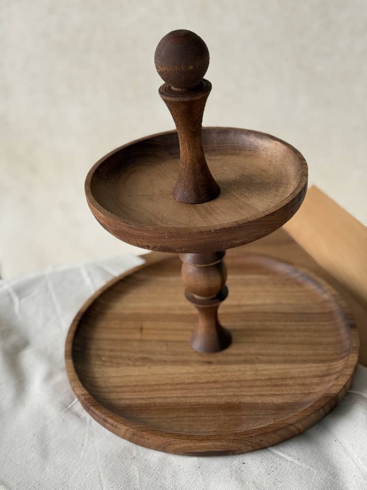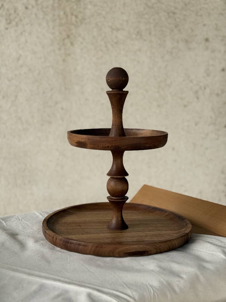 این شیرینیخوری با ابعاد ۳۰×۳۰ سانت، دارای دو طبقهی زیبا و کاربردی است که فضای کافی برای سرو شیرینی، میوههای کوچک، شکلات و مزههای مختلف فراهم میکند. استفاده از چوب طبیعی مرغوب و پرداخت دقیق، باعث شده بافت و رگههای اصیل چوب به بهترین شکل نمایان شوند و حس گرما و اصالت طبیعت را به خانه بیاورند.